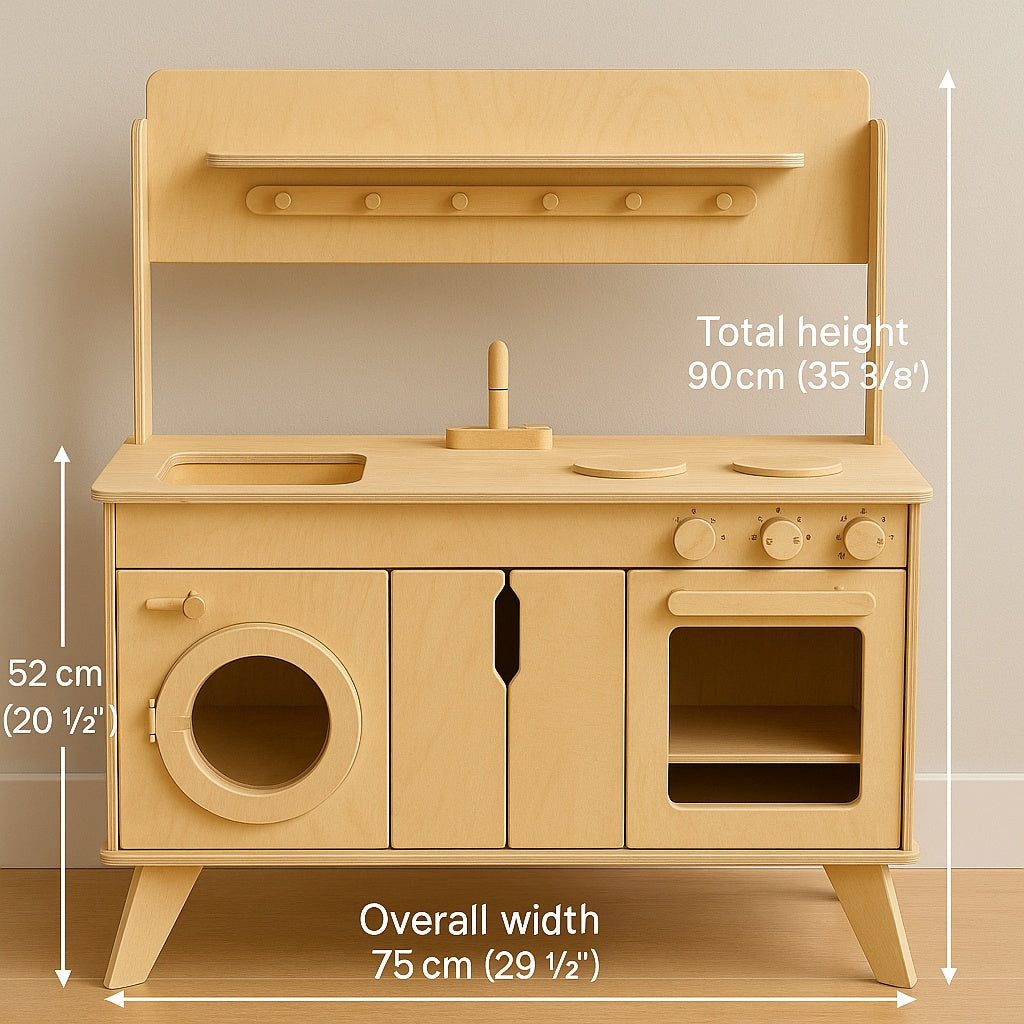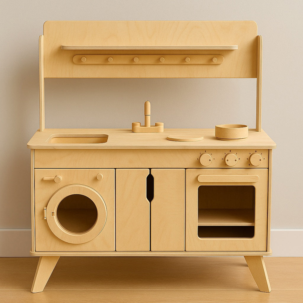 This beautifully handcrafted wooden play kitchen is a dream toy for curious little chefs aged 2 to 6 years. With its minimalist Scandinavian design and natural wood finish, it blends perfectly into modern homes, playrooms, and Montessori spaces.
